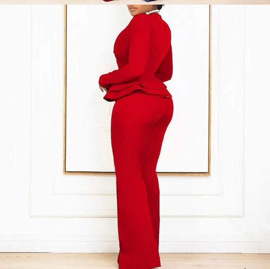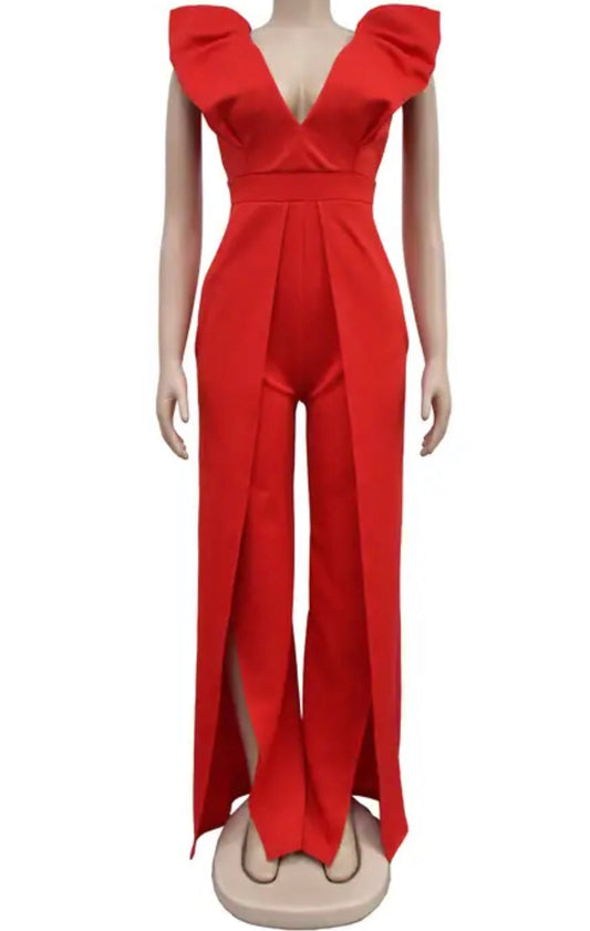 Red Deep V-Neck Ruffle Sleeves. Long Wide Slit Leg Pants - One Piece Jumpsuit