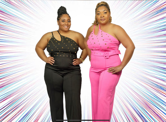 Pink Beaded Asymmetrical Inclined Shoulder Rivet BodyCon Wide Leg Jumpsuit Romper with Belt