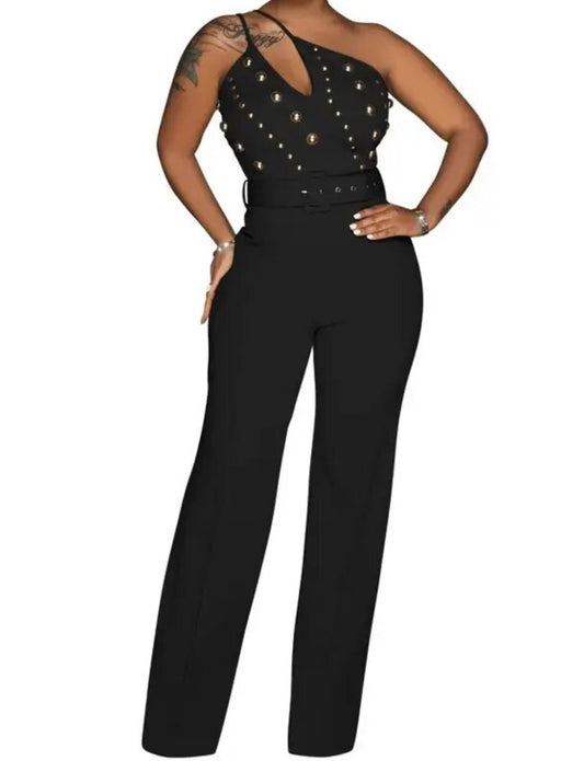 Black Beaded Asymmetrical Inclined Shoulder Rivet BodyCon Wide Leg Jumpsuit Romper with Belt