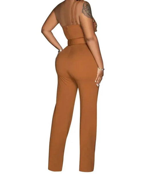 Brown Beaded Asymmetrical Inclined Rivet BodyCon Wide Leg Jumpsuit Romper with Belt