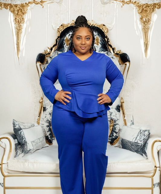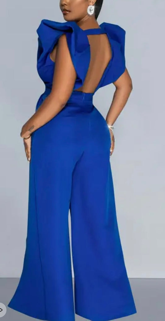 Blue Deep V-Neck Ruffle Sleeve Long Wide Slit Leg Pants - One Piece Jumpsuit