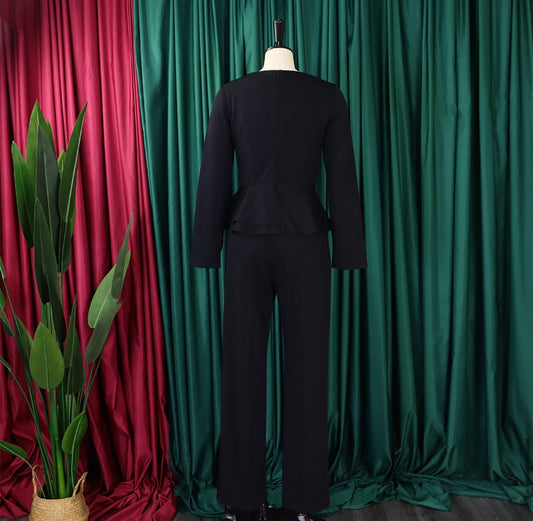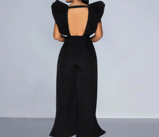 Black Deep V-Neck Ruffle Sleeves Long Wide Slit Leg Pants - One Piece Jumpsuit
