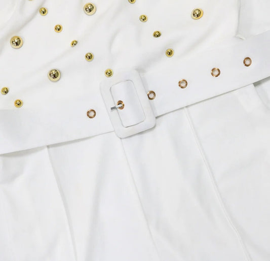White Beaded Asymmetrical Inclined Shoulder Rivet BodyCon Wide Leg Jumpsuit Romper with Belt