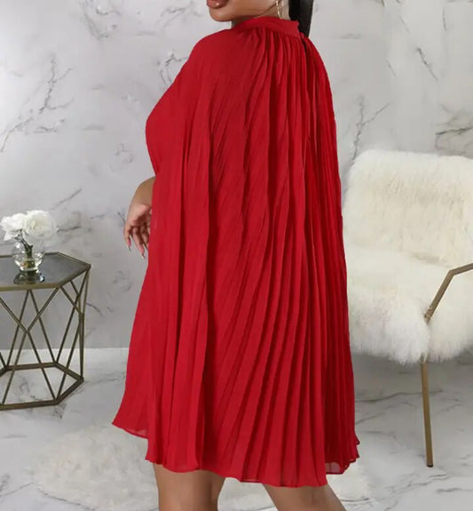Red Mock Neck Cloak Sleeve Oversized Pleated Cape Dress