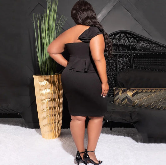 Black One-Shoulder Ruffles Chic Midi Split Dress