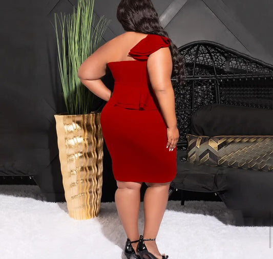 Red One-Shoulder Ruffles Solid Color Chic Midi Split Dress
