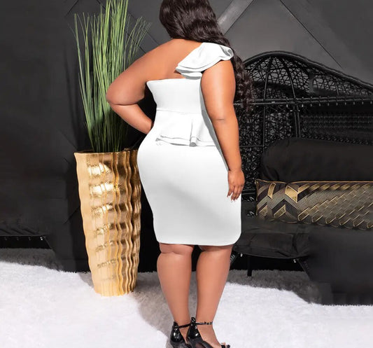 White One-Shoulder Ruffles Solid Color Chic Midi Split Dress