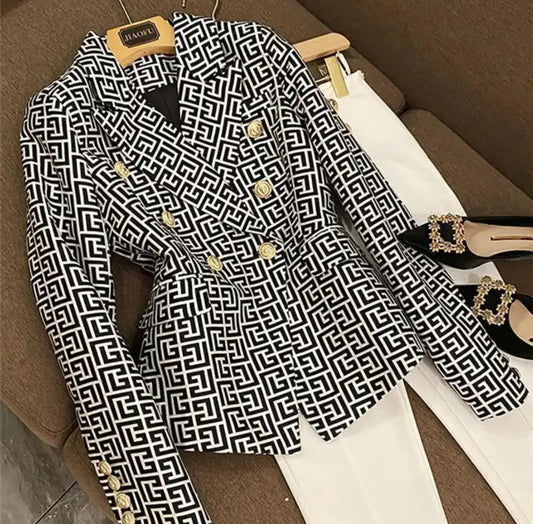 Geometric Print Notched Collar Gold Buttons Straight Fit Blazer