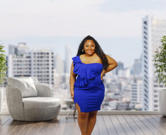 Blue One-Shoulder Ruffles Solid Color Chic Midi Split Dress