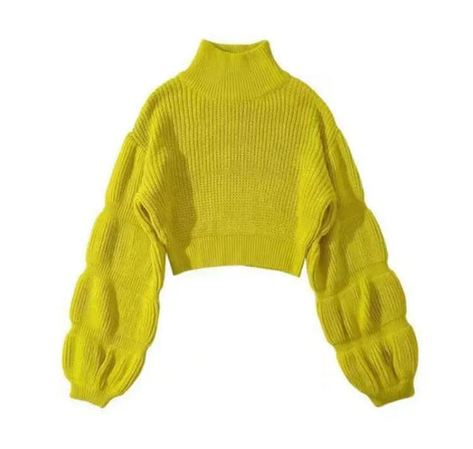Cropped Bubble Long Sleeve Sweater (Yellow) - Turtleneck Collar