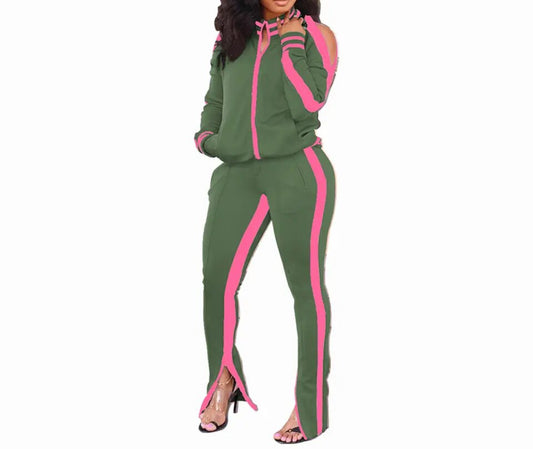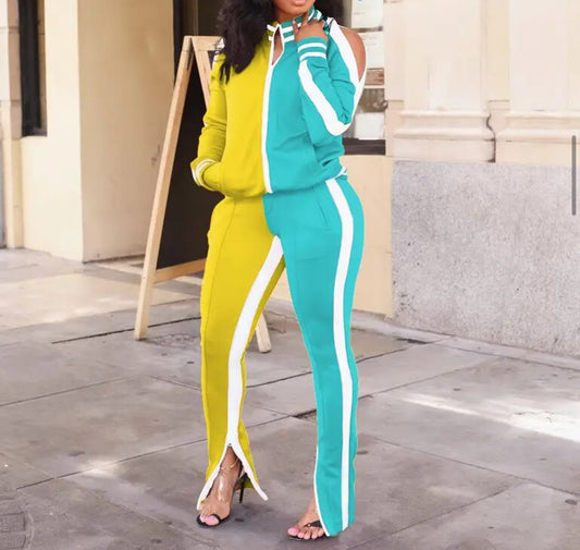 Two Piece Color Block Cold Shoulder Long Sleeve Tracksuit