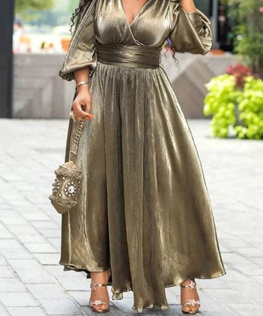 Metallic Shimmer V-Neck High Waist Ankle-Length Evening Dress