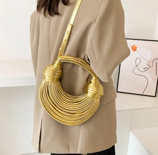 Gold Crossbody Noodle Roped Knotted Pulled Hobo Crescent Shaped Evening Clutch
